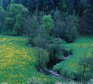 kleine Bäche und Teiche, offene Wiesen sowie ausgedehnte Laub- und Mischwälder bilden die reizvolle landschaftliche Umgebung